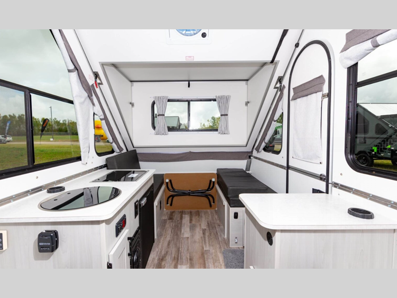Each camper includes aluminum wheels, vacuum bonded wall construction, and a Dexter rubber torsion axle for smooth towing! There are two exterior baggage doors for your luggage, an outside shower to wash off hiking gear, and front utility lights to name a few outdoor conveniences. Head inside to find LED lights, electrical outlets, and an 18,000 BTU furnace to keep you comfortable!